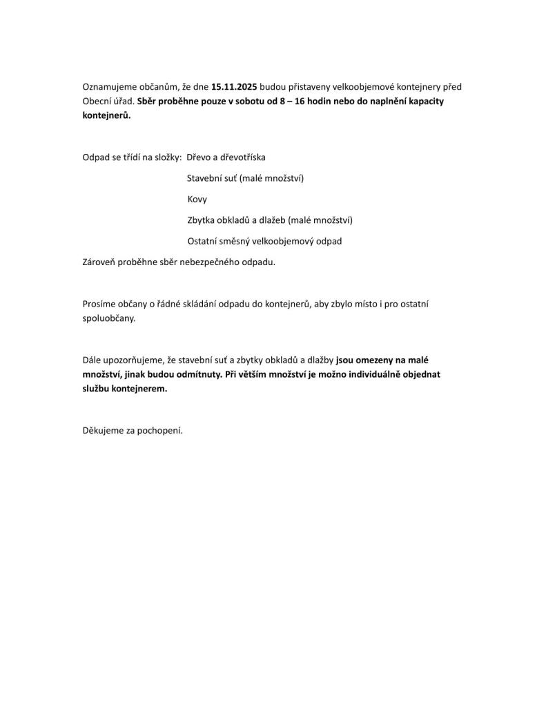 Oznamujeme občanům, že dne 15.11.2025 budou přistaveny velkoobjemové kontejnery před Obecní úřad. Sběr proběhne pouze v sobotu od 8 - 16 hodin. Děkujeme za pochopení.